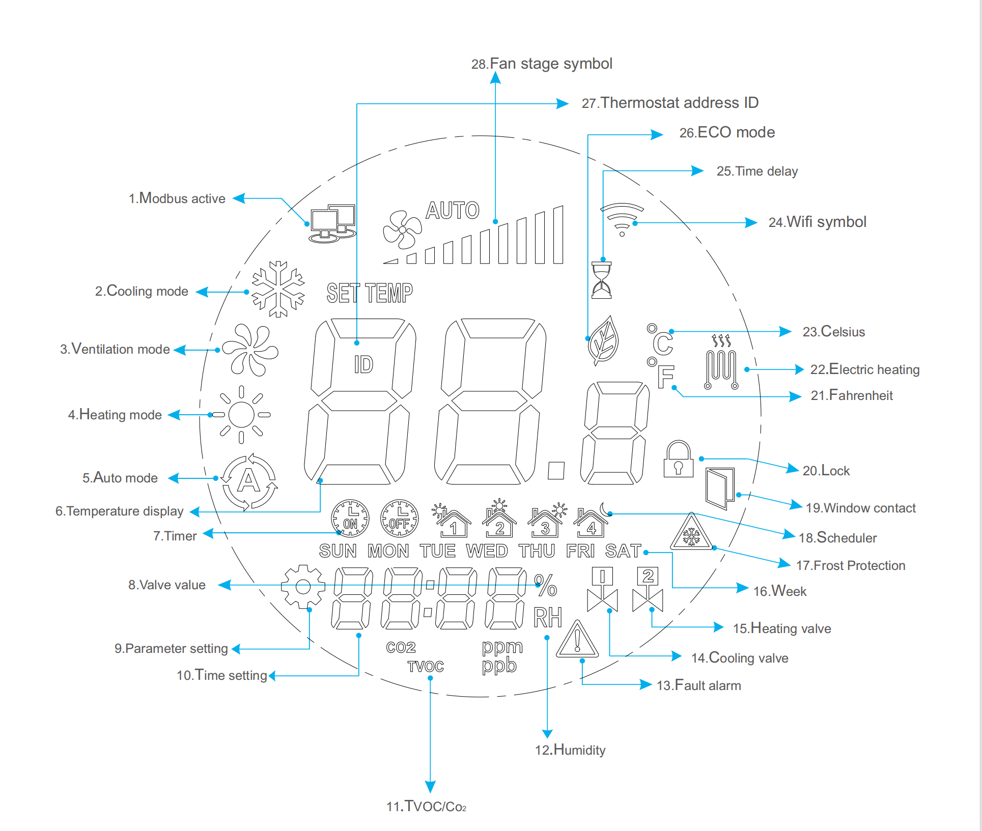 Termostat Dual-Ring FC610, dengan pengendali mikrokomputer dan teknologi komunikasi Wi-Fi untuk mendeteksi perbedaan suhu antara suhu ruangan dan suhu pengaturan, kemudian melalui pengendalian kipas, katup ON/OFF, dan katup modulasi guna menjaga suhu ruangan tetap nyaman dan konstan. Produk seri ini cocok untuk mengendalikan fan coil dua pipa atau empat pipa, katup motorik dua kawat atau tiga kawat, kipas tiga tahap, kipas EC, serta sistem pemanas lantai berbasis air. Anda juga dapat mengendalikan termostat ini dari mana saja melalui aplikasi (APP) di ponsel Anda, serta dilengkapi antarmuka RS485 satu arah ke sistem kontrol BMS untuk memungkinkan pengendalian dan manajemen terpusat.