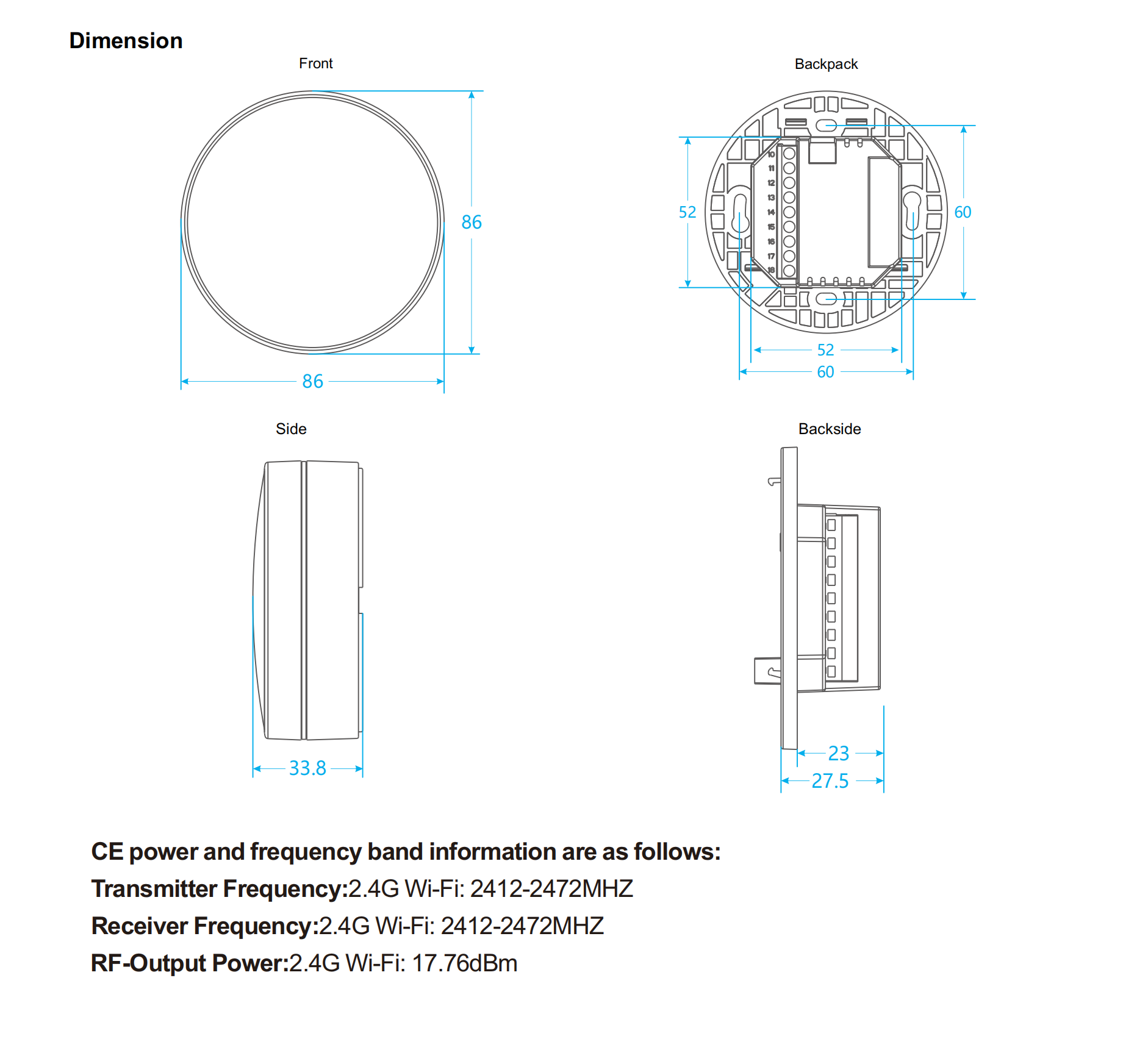 Ditempatkan rata dengan kotak dinding standar 86*86 (Ø=60 mm) |